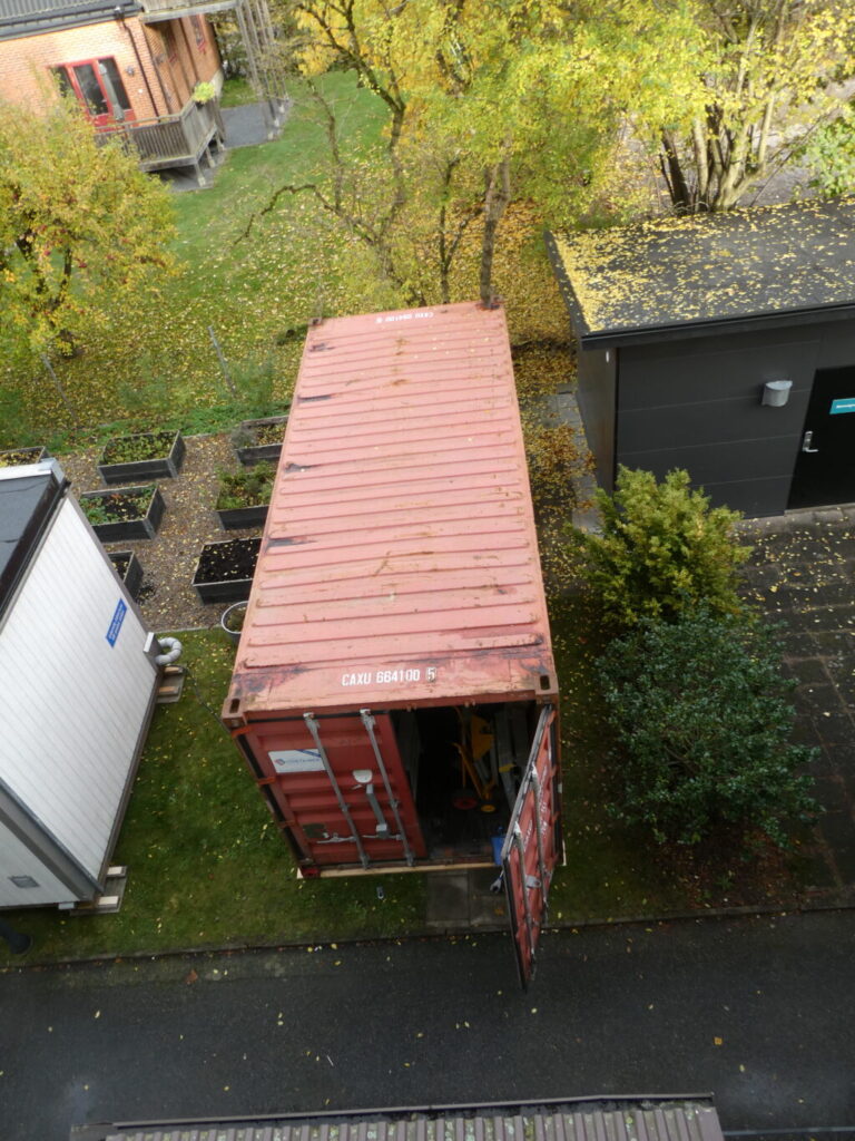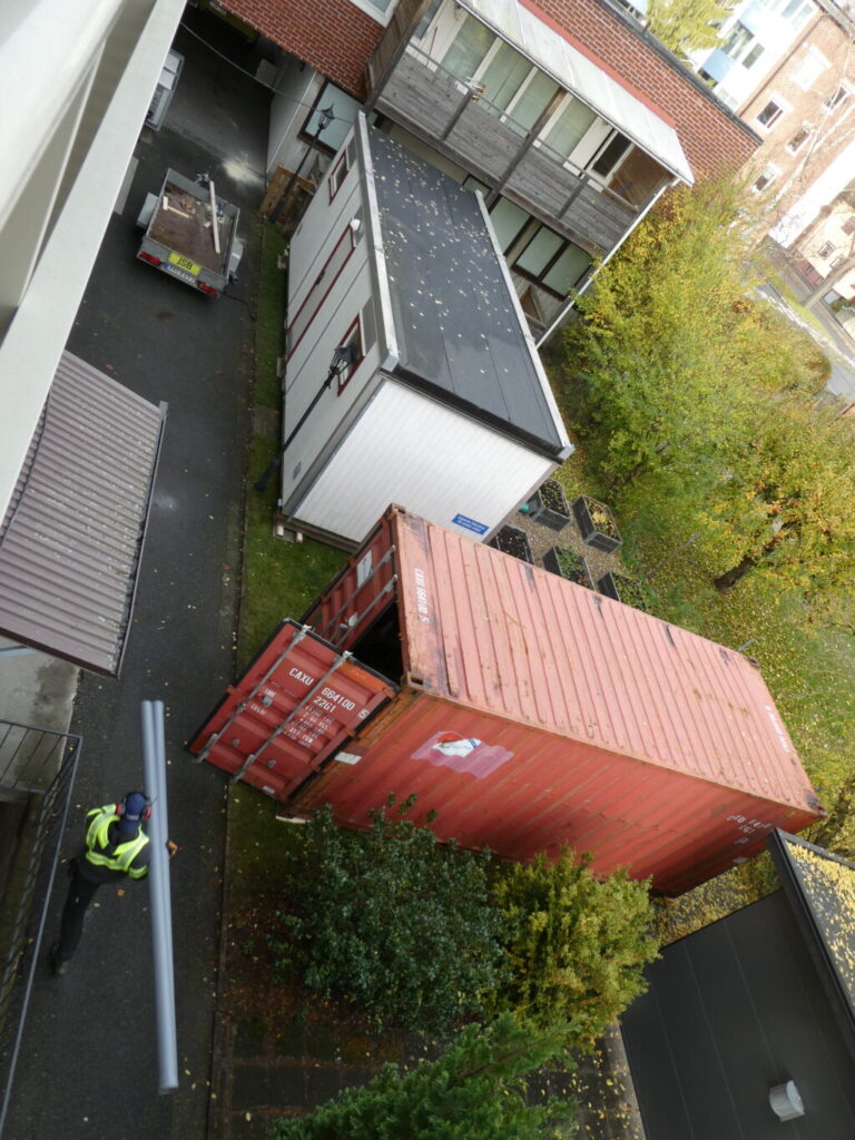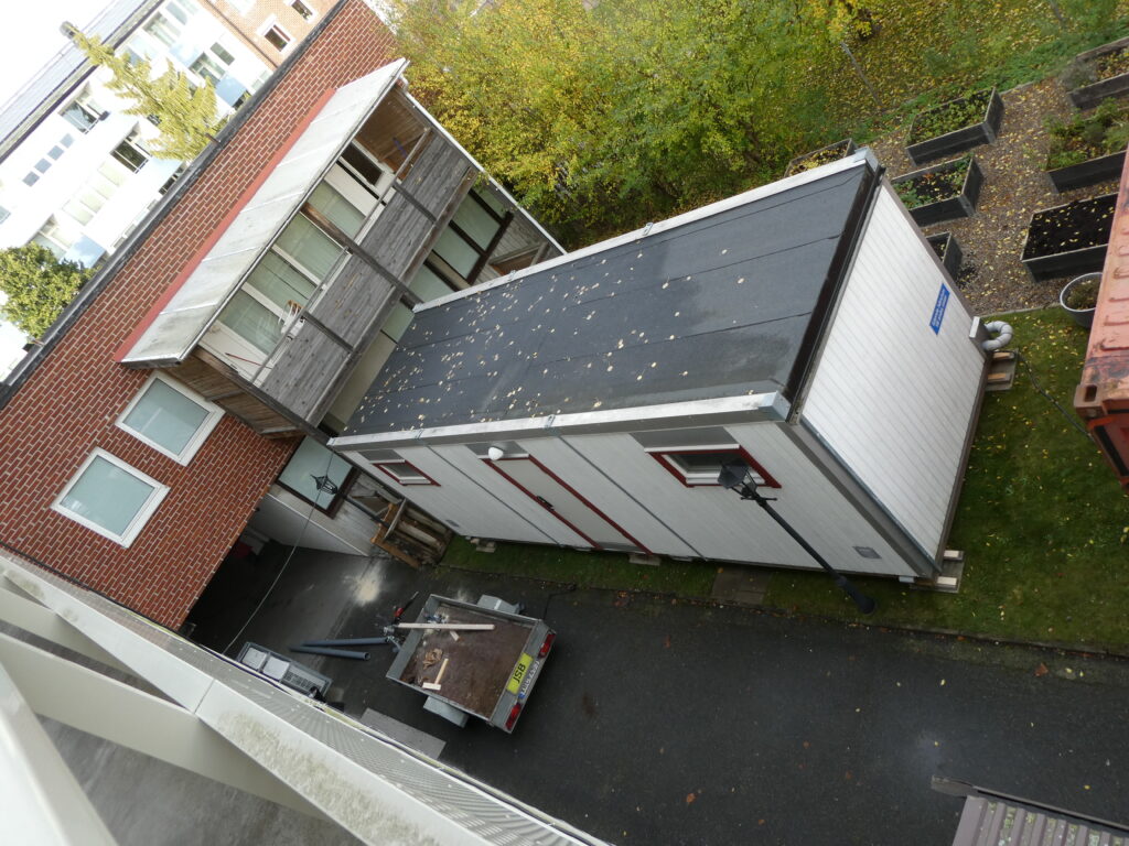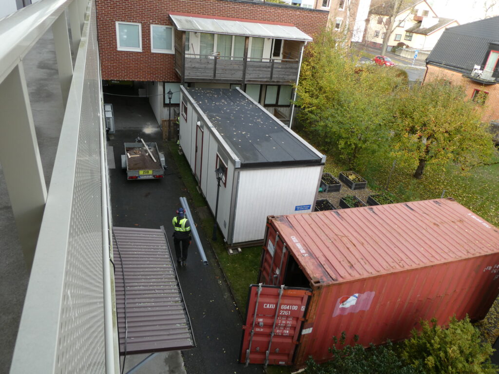 I det röda huset har hantverkarna sin arbetsbod. I det vita huset skall vi hyresgäster gå på toaletten.