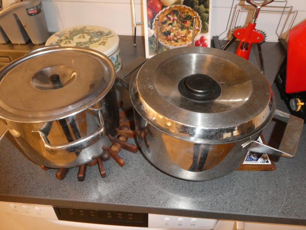 Men en modern spis kräver moderna grytor och kastruller. Två mindre grytor som jag hade med mig från Karlshamn går bra att använda men två större är för gamla. Det är bara att slänga i soporna. Jag som varit så stolt över dessa rostfria grytor tillverkade på Olofströms bruk i Blekinge.