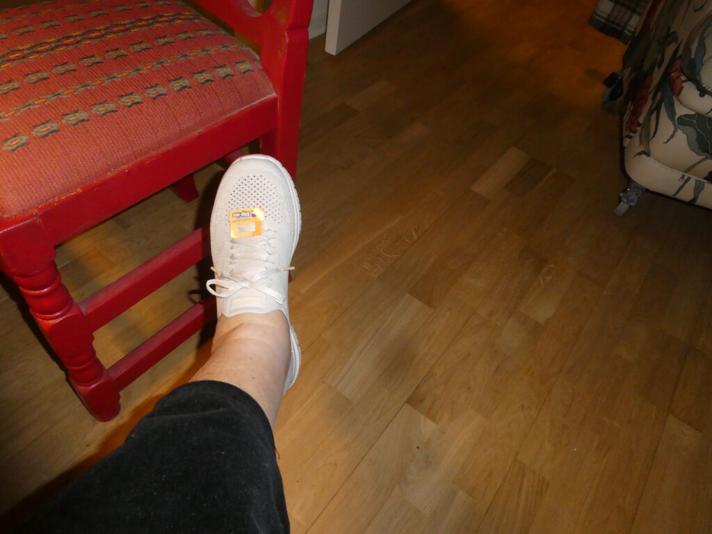 För mig som är 85 år var det skönt att få sitta och vila innan nyfikenheten drev mig vidare till mer inköp än bara skor. Skokartongen finns med på bilden.