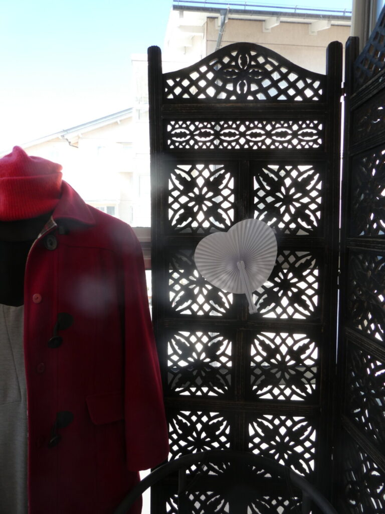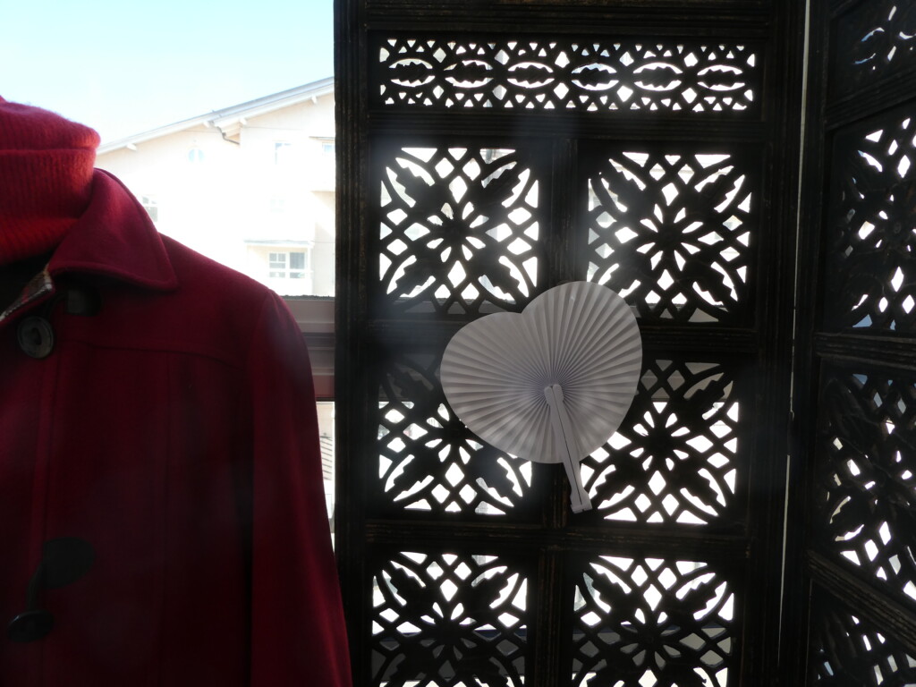 En skyltdocka, en vikvägg och en solfjäder i hjärtform.