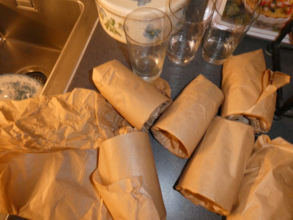Tolv vackra slipade dricksglas packas upp. Alla mina prylar var oskadade efter flytten. Ni ser vad väl jag paketerat glasen med ett tunt papper.