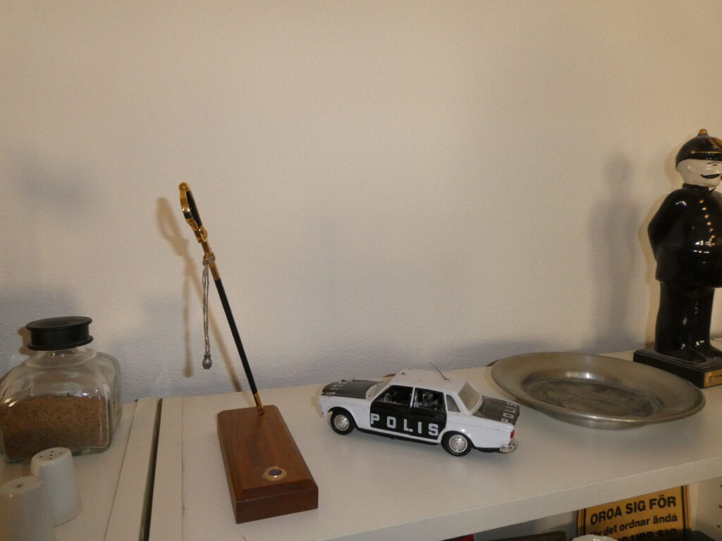 Jag har hunnit med att ordna bland mina småsaker ovanpå min bokhylla. Här ”polissaker”.