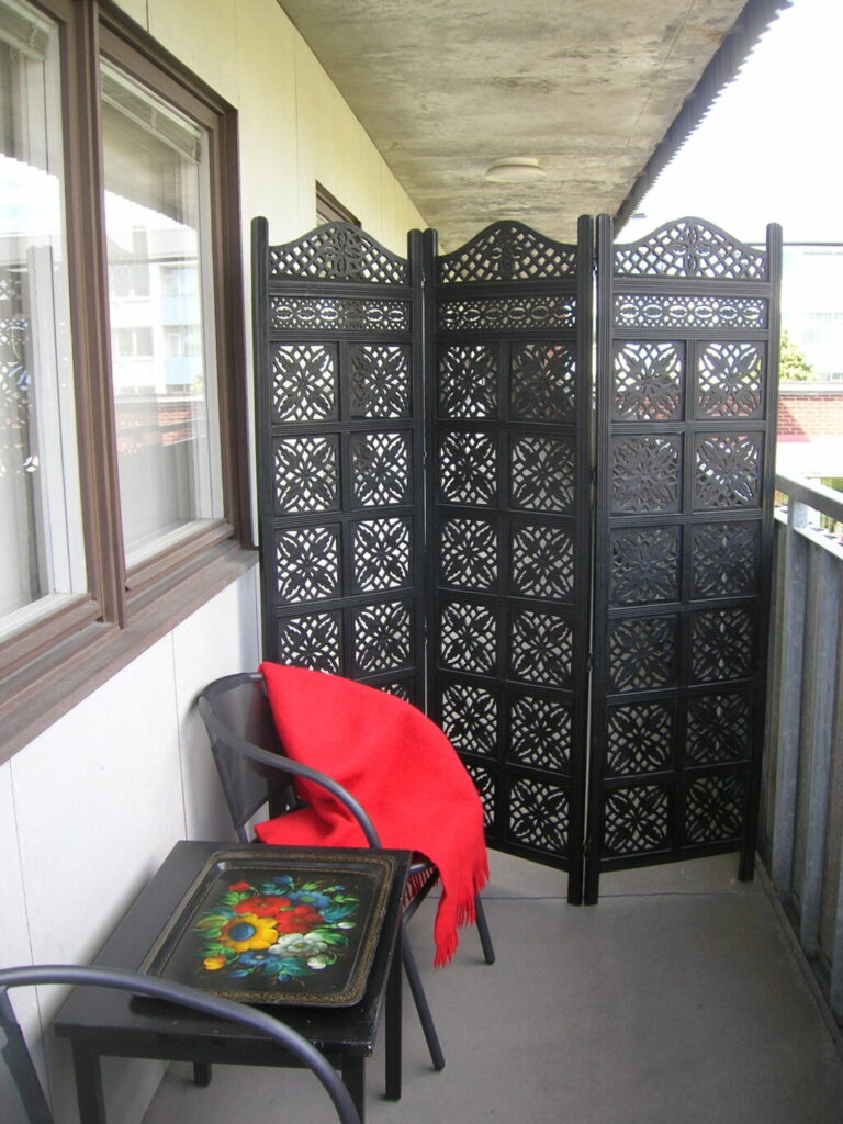 Loftgångens matplats. Här har jag ätot alla mina måltider under sommarmånaderna. Denna uteplats kommer jag att sakna oerhört. Mitt nya boende blir det bara en inglasad balkong åt väster.
